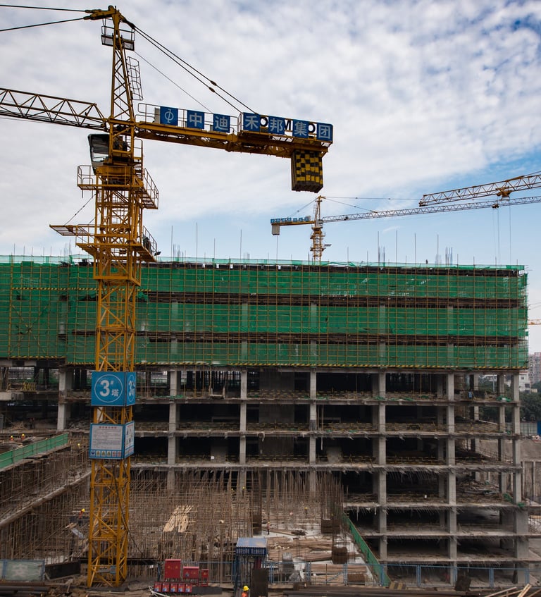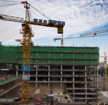RCC frame and deep‑basement construction for a high‑density commercial block in an urban setting, using tower cranes, modular formwork, and tightly sequenced pours to maintain speed, quality, and safety while working around neighbouring buildings and active roads.