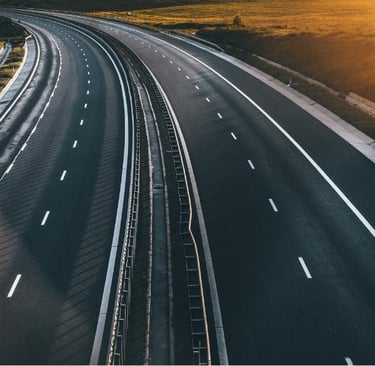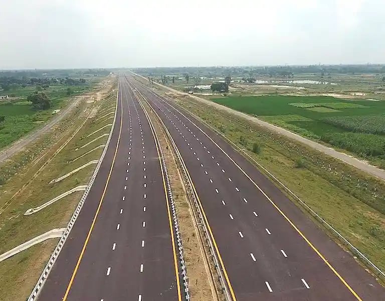 Construction of a new multi‑lane expressway carriageway across greenfield terrain, including embankment formation, sub‑base, and bituminous layers, with careful attention to drainage, side slopes, and pavement smoothness to support long‑distance, high‑speed traffic.