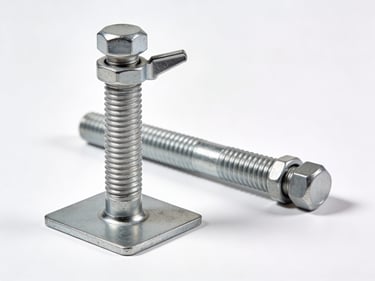 Jack bolts and silver screw jacks with base plates and wing nuts for precise height adjustment and levelling.